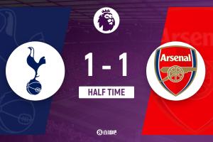 上半场伤停补时8分钟,半场结束,阿森纳暂1-1热刺。