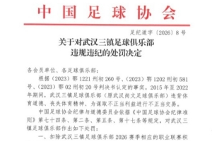 体育资讯1月29日讯 今日,中国足协公布了“假赌黑”专项整治行动武汉三镇的出发决定,与体育资讯此前透露的信息一致,武汉三镇被扣除2026赛季职业联赛积分5分,并罚款人民币80万元。
