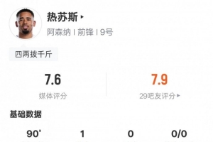 体育资讯2月16日讯 足总杯第4轮,阿森纳4-0维冈竞技。热苏斯首发出战,1射门1射正打进1粒进球,另外他还有1次过人成功,但也有16次丢失球权,评分7.6。