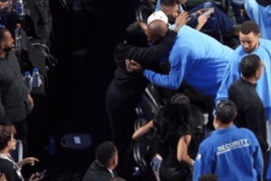 ESPN洛杉矶分部官方Instagram晒出一段现场花絮,赛前美国星条队球星詹姆斯在场边深情拥抱了自己的母亲格洛丽亚。