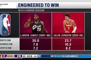 老鹰客场挑战湖人,转播方晒出杰伦·约翰逊和詹姆斯生涯第五个赛季的数据对比,老鹰官推转发。
